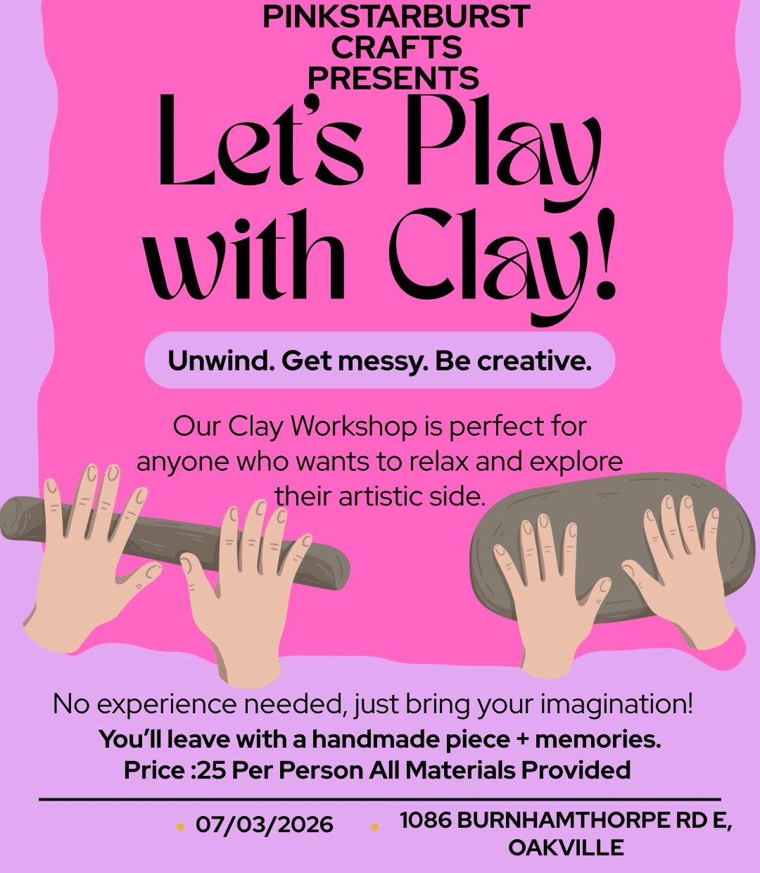 Our creative clay workshop is perfect for anyone who wants to relax and explore their artistic side! Every participant will leave will a handcrafted item, all materials are provided.